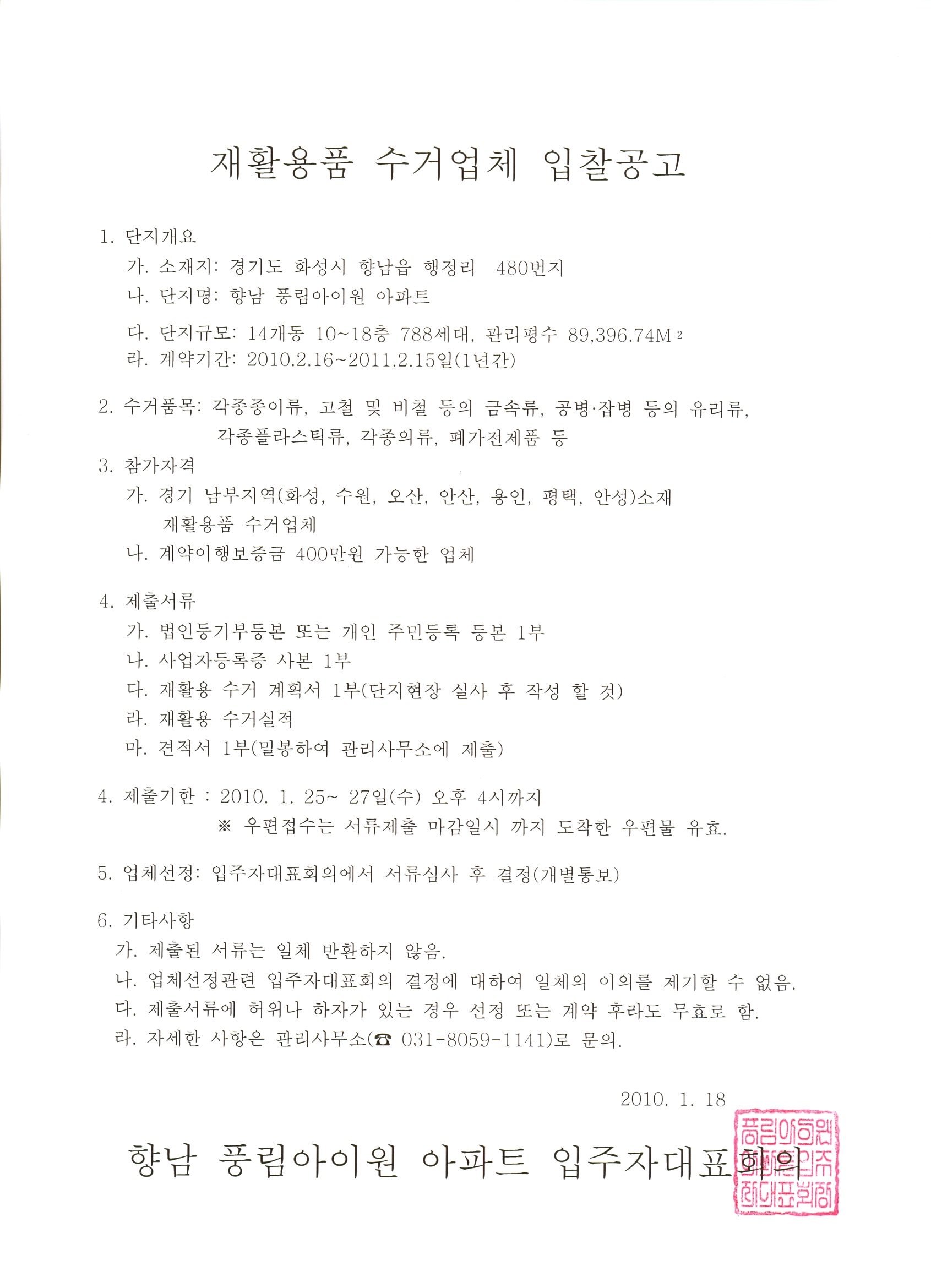 | 내용 | ![]() 화성|2010.1.18|2010.1.27|향남풍림아이원APT||cafe.daum.net/hyiwant|입주자대표회의 |031-8059-1141|031-8059-1140|경기도 화성시 향남읍 행정리 480번지| 재활용품 수거업체 입찰공고 1. 단지개요 가. 소재지: 경기도 화성시 향남읍 행정리 480번지 나. 단지명: 향남 풍림아이원 아파트 다. 단지규모: 14개동 10~18층 788세대, 관리평수 89,396.74M 라. 계약기간: 2010.2.16~2011.2.15일(1년간) 2. 수거품목: 각종종이류, 고철 및 비철 등의 금속류, 공병·잡병 등의 유리류, 각종플라스틱류, 각종의류, 폐가전제품 등 3. 참가자격 가. 경기 남부지역(화성, 수원, 오산, 안산, 용인, 평택, 안성)소재 재활용품 수거업체 나. 계약이행보증금 400만원 가능한 업체 4. 제출서류 가. 법인등기부등본 또는 개인 주민등록 등본 1부 나. 사업자등록증 사본 1부 다. 재활용 수거 계획서 1부(단지현장 실사 후 작성 할 것) 라. 재활용 수거실적 마. 견적서 1부(밀봉하여 관리사무소에 제출) 4. 제출기한 : 2010. 1. 25~ 27일(수) 오후 4시까지 ※ 우편접수는 서류제출 마감일시 까지 도착한 우편물 유효. 5. 업체선정: 입주자대표회의에서 서류심사 후 결정(개별통보) 6. 기타사항 가. 제출된 서류는 일체 반환하지 않음. 나. 업체선정관련 입주자대표회의 결정에 대하여 일체의 이의를 제기할 수 없음. 다. 제출서류에 허위나 하자가 있는 경우 선정 또는 계약 후라도 무효로 함. 라. 자세한 사항은 관리사무소(☎ 031-8059-1141)로 문의. 2010. 1. 18 향남 풍림아이원 아파트 입주자대표회의 || |