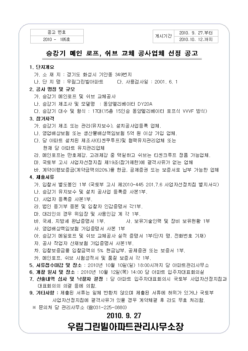 - 승강기메인로프쉬브교체공사업체선정공고.hwp (54.5K) 2회 다운로드 | DATE : 2010-10-05 15:45:10