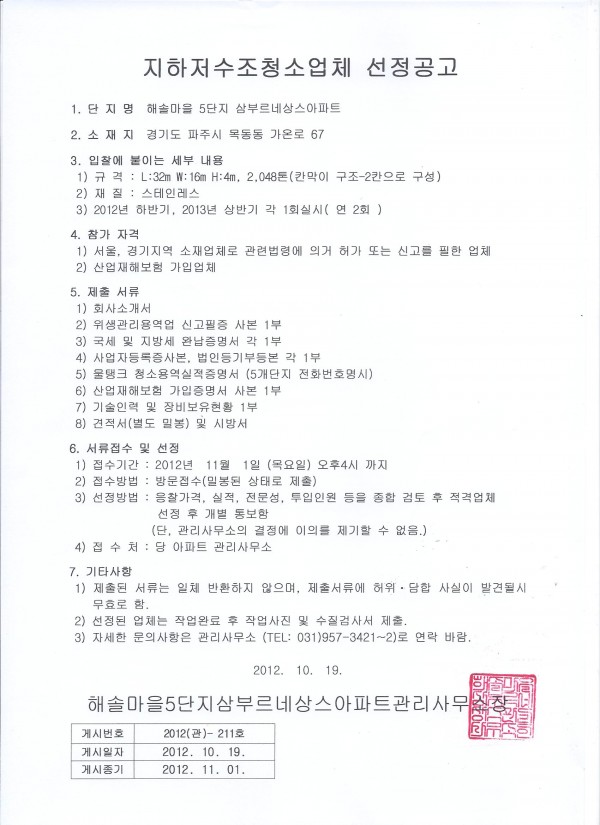 7. 기타사항 1) 제출된 서류는 일체 반환하지 않으며, 제출서류에 허위ㆍ담합 사실이 발견될시 무효로 함. 2) 선정된 업체는 작업완료 후 작업사진 및 수질검사서 제출. 3) 자세한 문의사항은 관리사무소 (TEL: 031)957-3421~2)로 연락 바람.
