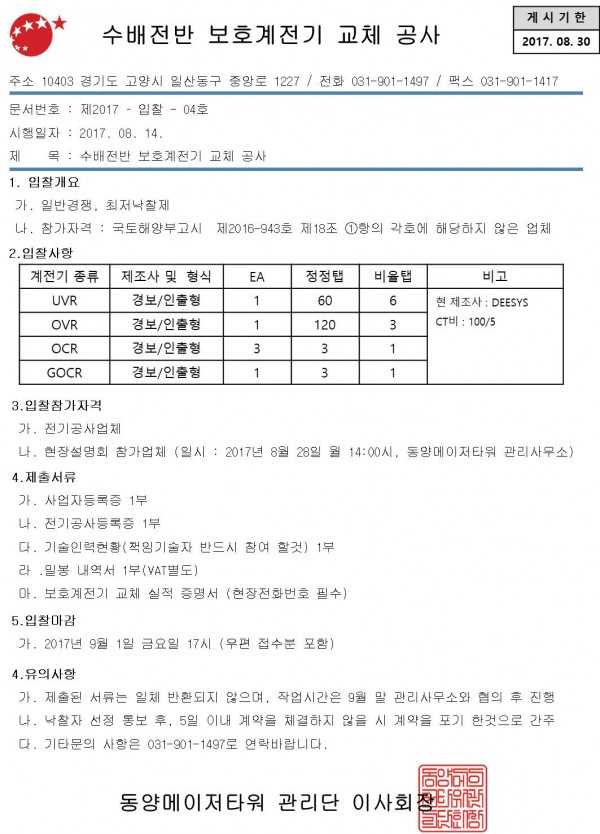 | 입찰제목 | 수배전반 보호계전기 교체 공사 | ||