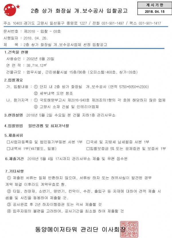 자체입찰공고 동양메이저타워 2층 상가 화장실 개.보수공사